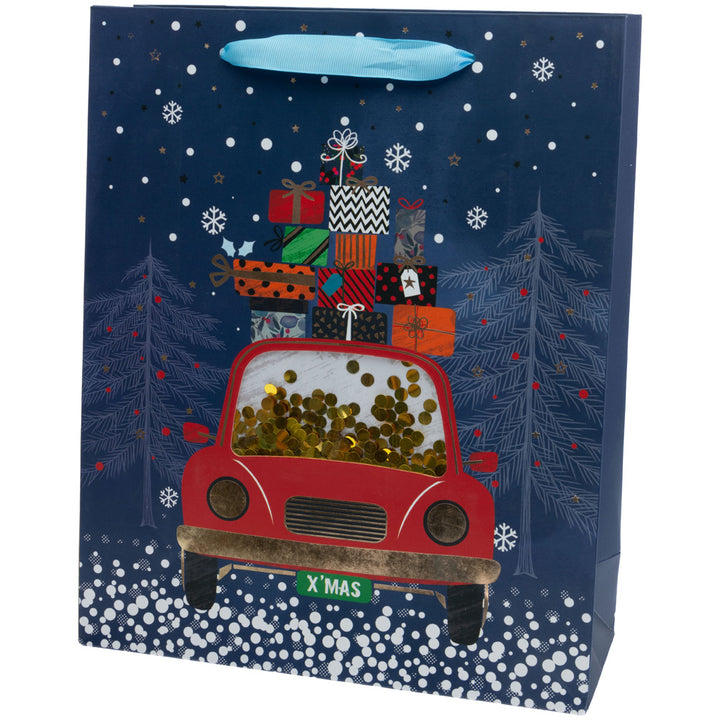 Bring gift-giving to life with this large paper bag, showcasing a playful car stacked with presents and a shaker-style sequin window that shimmers in motion. Generously sized and sturdy, it holds bigger treasures with ease while delivering festive flair from doorstep to celebration. Approximate dimensions are 10 x 4 x 12.5 inches.