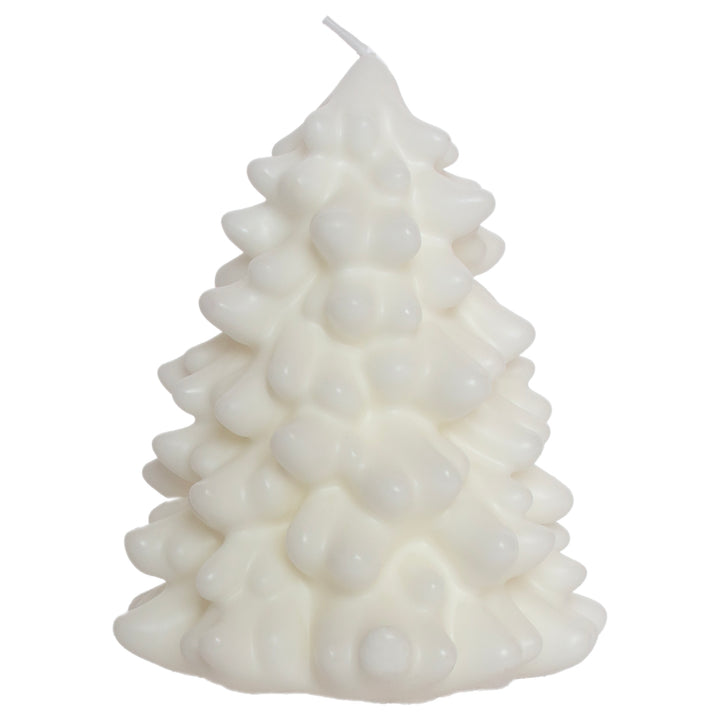 Shaped in a sculptural spruce silhouette, this small paraffine candle lends a soft, pure-white glow to shelves, mantels, or tablescapes. Display it solo for a serene focal point or cluster multiples for a modern, nature-inspired accent. Approximate dimensions are 3 x 3 x 4 inches.