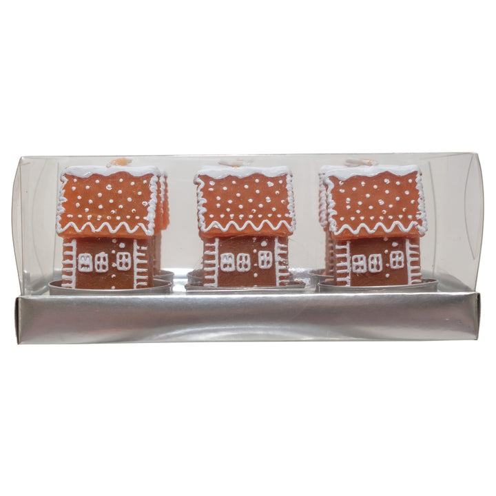 Bring storybook charm to any setting with this set of six paraffine candles shaped like tiny gingerbread houses, finished with icing-like detailing and snug metal cups. Boxed for effortless gifting or storage, these petite accents lend a warm, playful glow to place settings, mantels, or a cozy vignette. Approximate dimensions are 1.25 x 1.25 x 2 inches.