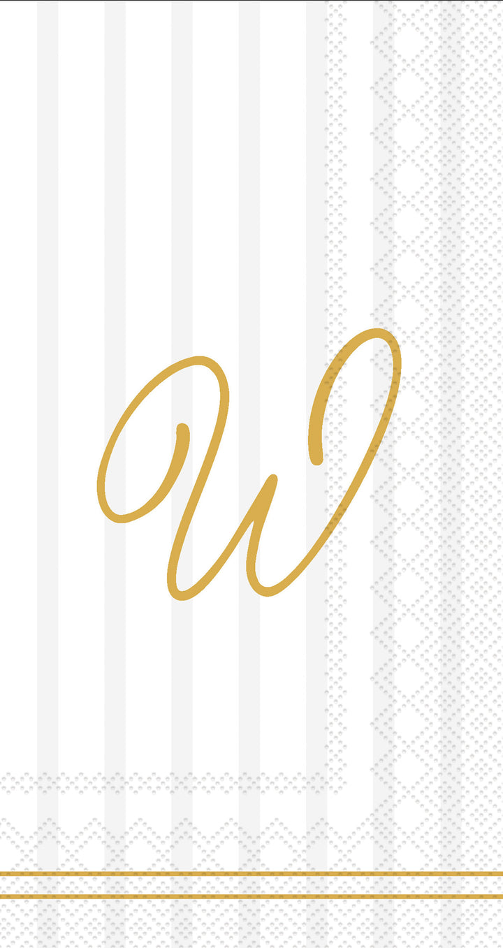 CHIC MONOGRAM W cream guest towels bring a refined, personalized touch to the powder room, pairing a warm gold script W with subtle tonal striping and embossed detail. Crafted of soft, absorbent paper, these disposable towels deliver a fresh, polished presentation for everyday hosting and effortless entertaining. Approximate dimensions are 8.25 x 4.5 x 1 inches. German printed on soft, 3-ply paper.