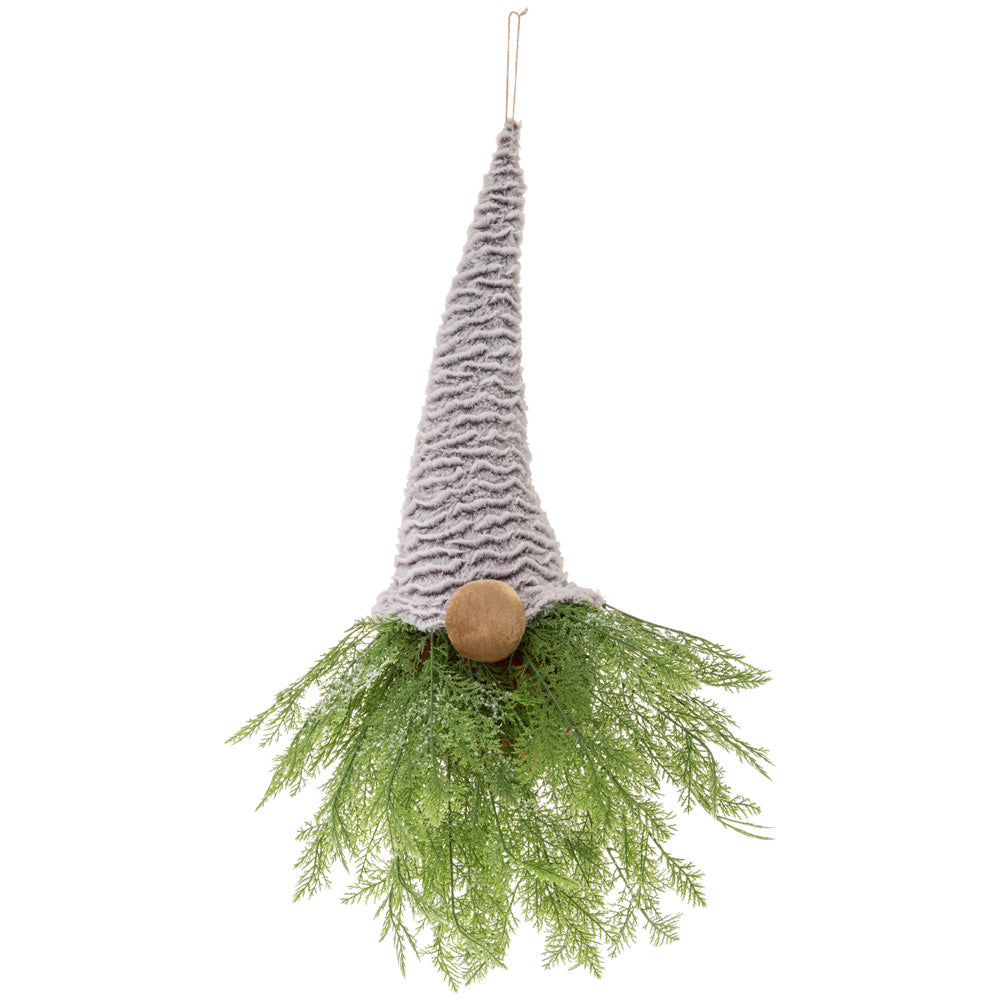 The Eldor Winter Gnome Tree Wreath in Grey pairs a textured pointed hat and sweet button nose with airy faux greenery for a playful, woodland welcome on any door or wall. Lightweight yet durable in foam, plastic, and polyester, it hangs with ease and keeps its fresh, artful shape with minimal upkeep. Approximate dimensions are 8 x 19 x 29.5 inches.