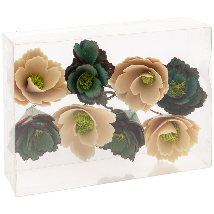 Handcrafted from curled wood with lively moss centers, these blooms showcase an airy aqua and natural palette that adds organic texture and soft dimension to any space. Scatter them across a tablescape, nestle into bowls and trays, or tuck into arrangements for a lasting botanical accent. Approximate dimensions are 8.5 x 6 x 2.5 inches.