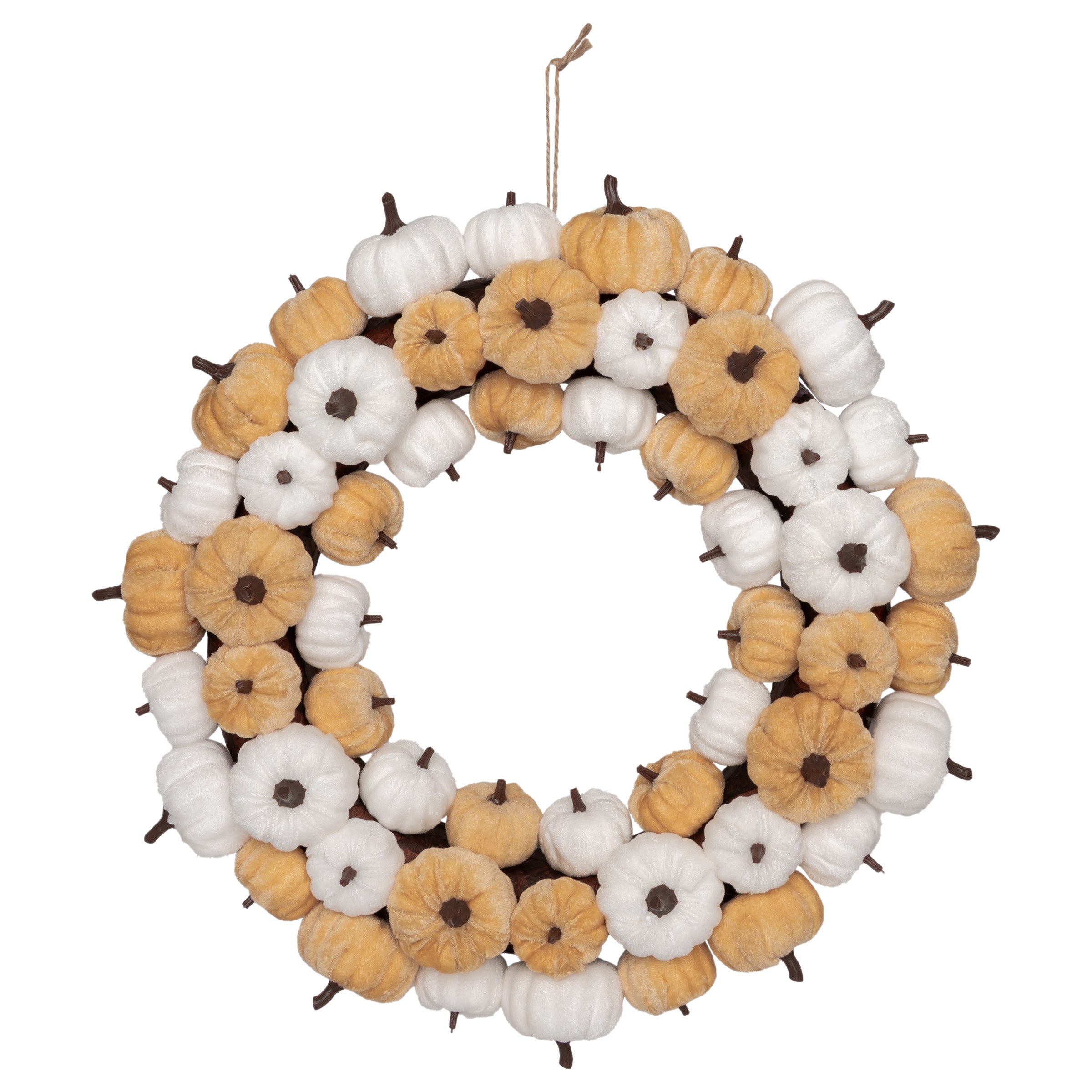 Plush, felted pumpkins in white and cream circle together to create a richly textured wreath that instantly softens an entry, mantel, or gallery wall. With its crisp palette and artisanal detail, this wall décor brings cozy, modern farmhouse charm while staying sophisticated enough for everyday styling. Approximate dimensions are 19 x 19 x 0 inches.