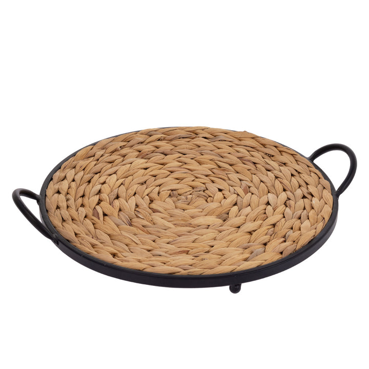 Naturally textured and generously sized, this large round tray pairs a woven corn-leaf surface with a sturdy metal rim and easy-grip handles for effortless serving from countertop to coffee table. Use it to corral everyday essentials or present drinks and appetizers—the blend of warm fiber and cool metal brings casual polish to any tabletop. Approximate dimensions are 17.25 x 17.25 x 1 inches.