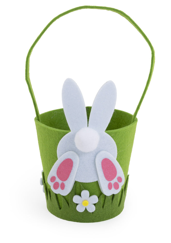 Playful and soft in felt, this Bunny Butt Felted Basket charms with a dimensional rabbit backside—complete with perky ears, a fluffy pom-pom tail, and sweet flower accents along a grassy rim. Lightweight yet sturdy with an easy-carry handle, it corrals small treasures, treats, or craft supplies while adding a wink of animal whimsy to shelves, tabletops, nurseries, and entryways. Approximate dimensions are 5 x 5 x 5 inches.