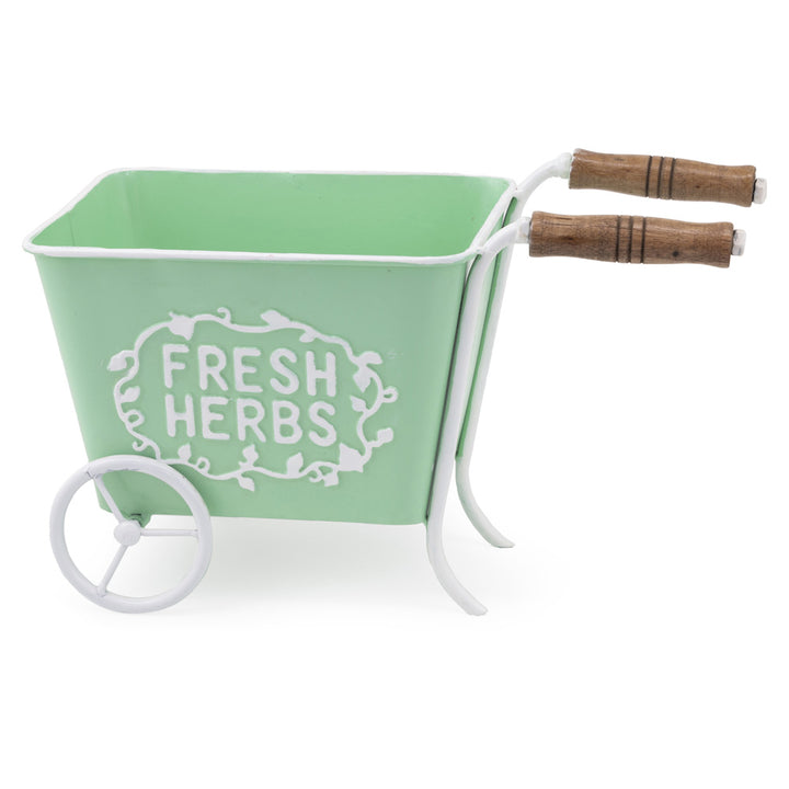 Infuse your space with garden charm using this mint-green cart planter, detailed with crisp white trim and a raised “Fresh Herbs” emblem. Its petite wheelbarrow silhouette—with turned handles and a single-spoke wheel—makes a cheerful accent for basil, succulents, or kitchen cuttings on a sill, shelf, or porch. Approximate dimensions are 11.5 x 6 x 7 inches.