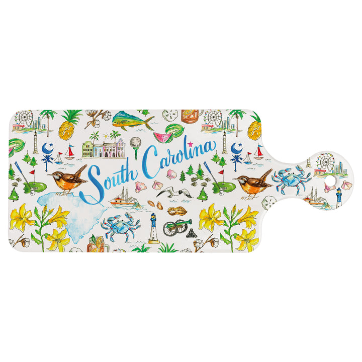 Celebrate state pride at every meal with this ceramic trivet, playfully patterned with iconic South Carolina motifs in a lively, illustrated style. Heat-resistant and easy to wipe clean, the SC State Cuterie protects countertops while providing a charming landing spot for hot dishes, teapots, and petite serveware. Approximate dimensions are 11.5 x 4.75 x .25 inches.