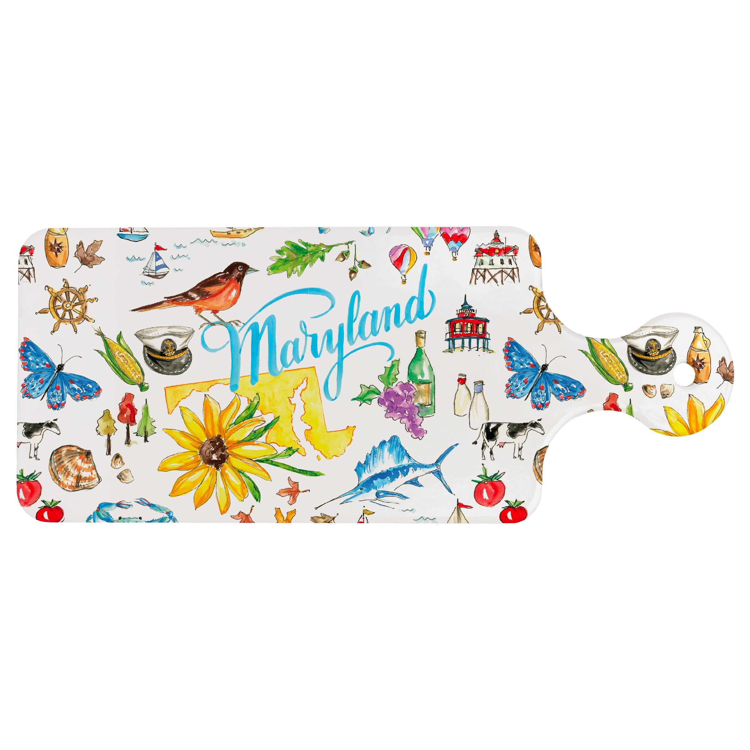 Celebrate Maryland with this ceramic MD State Cuterie trivet, showcasing a paddle-board profile and vibrant illustrations of local icons for instant table charm. Heat-resistant with a smooth, easy-clean finish, it protects surfaces from hot dishes while doubling as a petite serving perch or eye-catching display piece. Approximate dimensions are 11.5 x 4.75 x .25 inches.