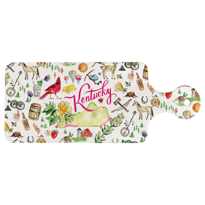 Serve up state pride with the KY State Cuterie, a ceramic trivet splashed with watercolor-style Kentucky icons and a vibrant script. Heat-resistant and easy to wipe clean, it shields countertops from hot dishes while lending playful charm to everyday spreads or open shelving. Approximate dimensions are 11.5 x 4.75 x .25 inches.