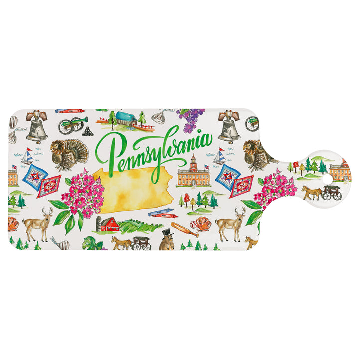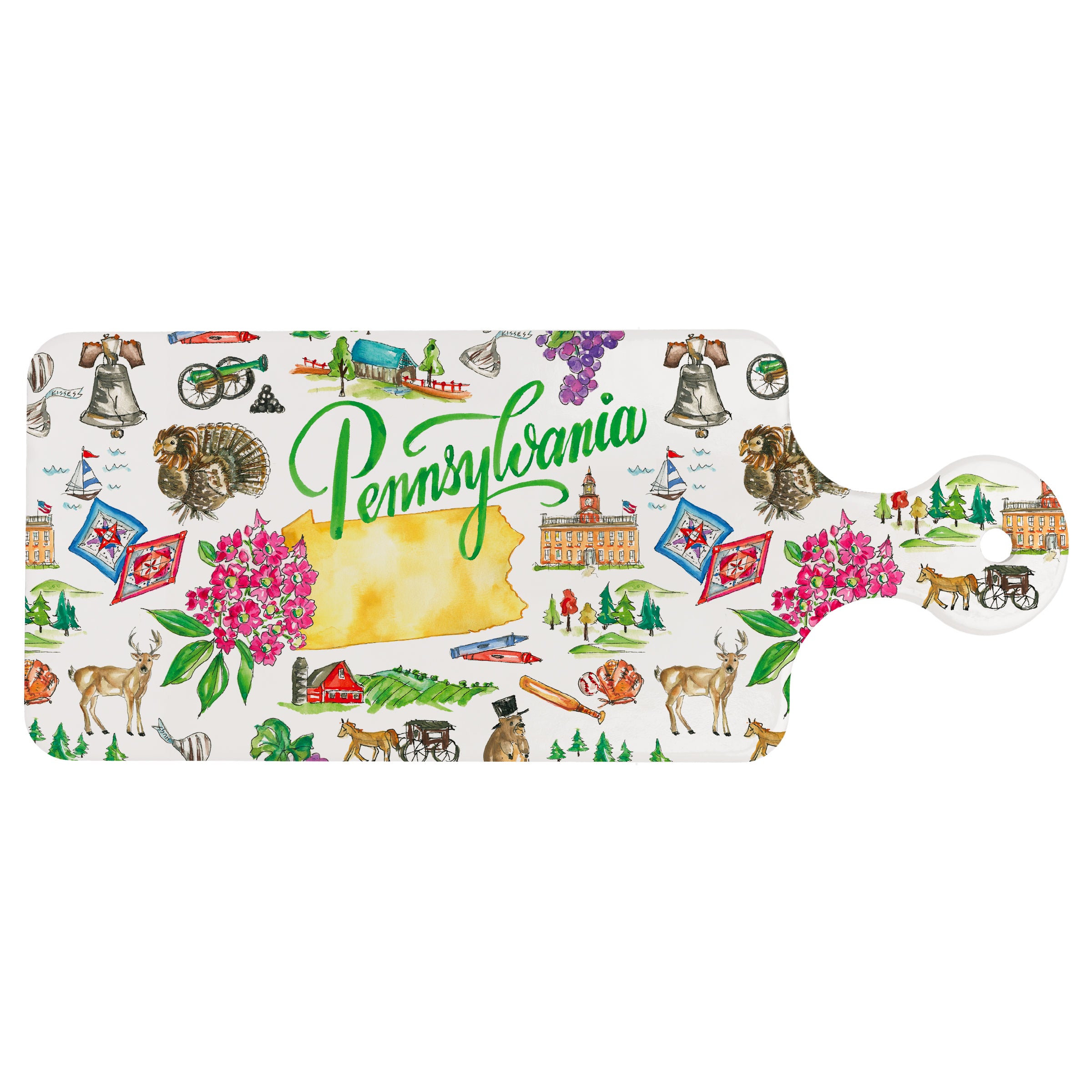 Celebrate the Keystone State with this ceramic trivet, splashed with charming Pennsylvania illustrations that bring hometown pride to the table. Durable and heat-resistant, it protects surfaces from hot pans and also doubles as a petite charcuterie perch or decorative display. Approximate dimensions are 11.5 x 4.75 x .25 inches.
