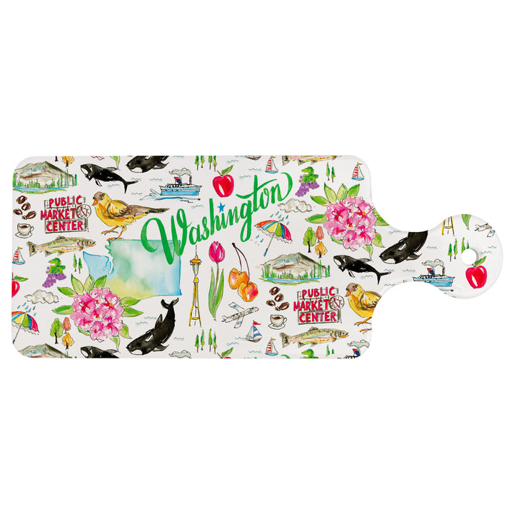 Bring the Evergreen State to your table with a ceramic trivet splashed in lively watercolor icons—whales, ferries, cherries, coffee, and alpine views—anchored by a bold “Washington” script. The hang-ready paddle handle makes it as display-worthy as it is useful, protecting surfaces from hot dishes while adding a cheerful pop to everyday serveware. Approximate dimensions are 11.5 x 4.75 x .25 inches.