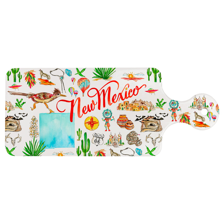 Celebrate the Land of Enchantment at your table with this ceramic NM State Cuterie trivet, splashed with vibrant New Mexico icons and bold script that instantly brightens any spread. Heat-ready and easy to wipe clean, it protects surfaces beneath hot dishes and doubles as a charming decorative accent between meals. Approximate dimensions are 11.5 x 4.75 x .25 inches.