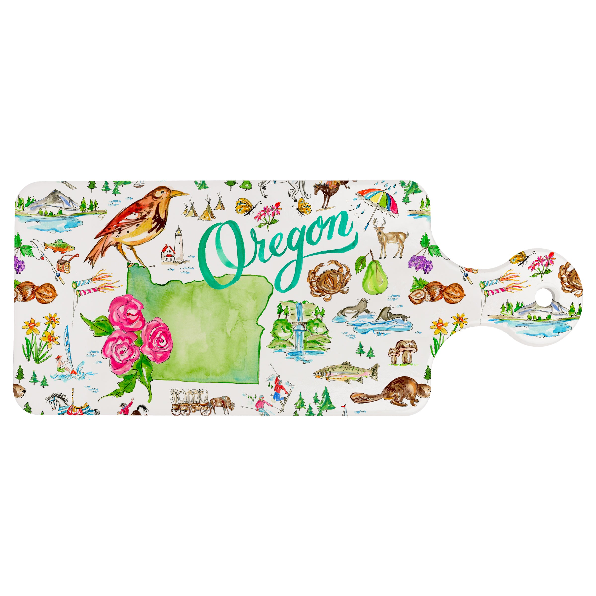 Show your Oregon pride with this ceramic trivet, splashed with whimsical watercolor icons and a bold state silhouette. Durable ceramic protects tabletops from hot dishes and doubles as a charming serveware accent or hangable display between meals. Approximate dimensions are 11.5 x 4.75 x .25 inches.