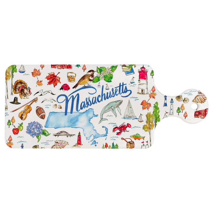 Celebrate Massachusetts at the table with this ceramic trivet, illustrated with lively state icons and a bold map motif. Heat-resistant ceramic protects surfaces while adding a charming layer beneath hot dishes, kettles, and bakeware. Approximate dimensions are 11.5 x 4.75 x .25 inches.