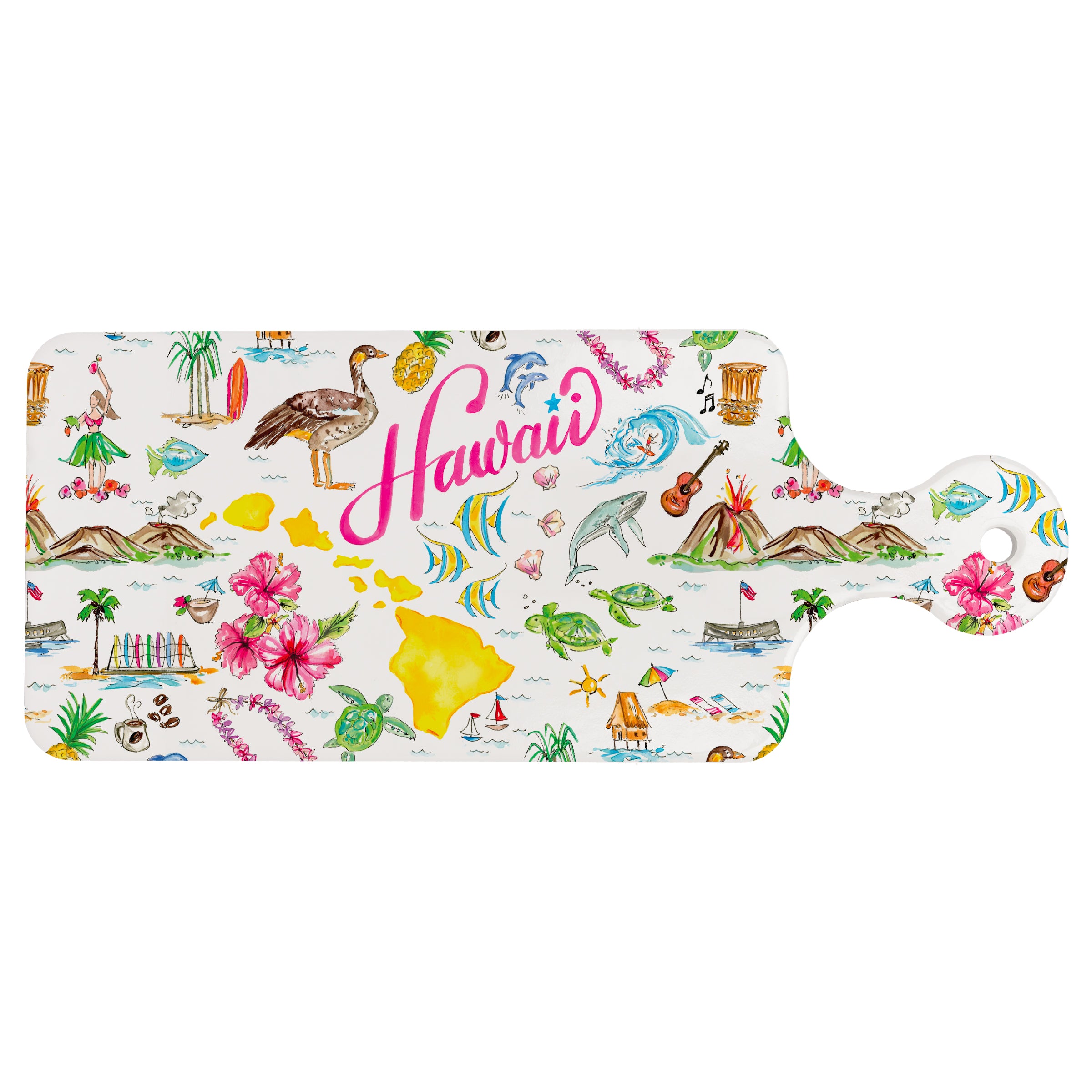 Bring island charm to your table with the ceramic HI State Cuterie trivet, illustrated with playful Hawaii icons from hibiscus and honu to ukuleles and rolling waves. Durable and heat-ready, it protects countertops from hot dishes and can double as a petite perch for mugs or small bites. Approximate dimensions are 11.5 x 4.75 x .25 inches.