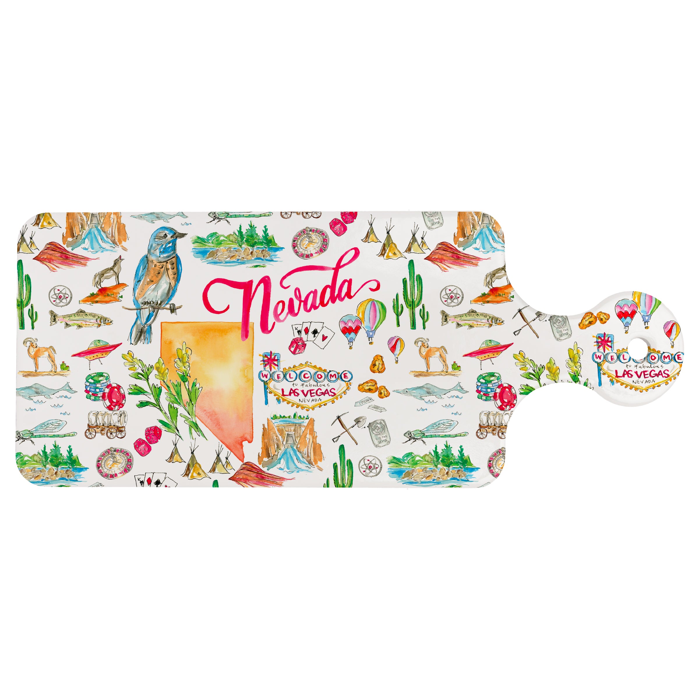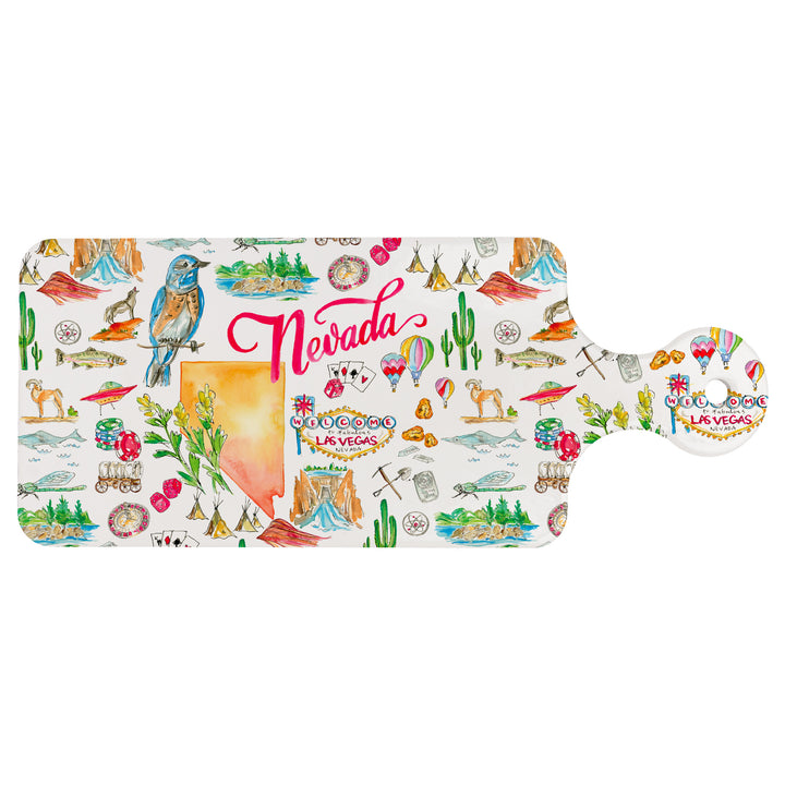 Bring a dash of state pride to the table with this ceramic trivet, playfully illustrated with Nevada’s icons and colors. Its heat-ready surface protects countertops from hot dishes, while the paddle silhouette doubles as a charming serveware accent on display between meals. Approximate dimensions are 11.5 x 4.75 x .25 inches.