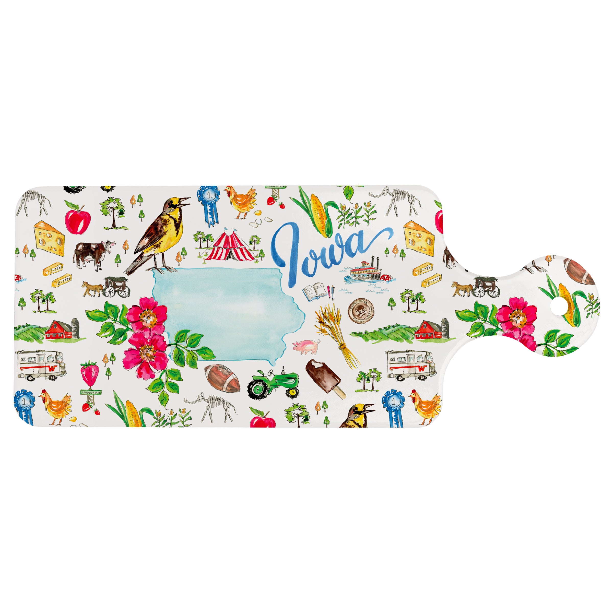 Celebrate Iowa at every meal with a glossy ceramic trivet alive with watercolor icons—corn, tractors, barns, blooms, and more—surrounding the state silhouette. Durable and heat-ready, it protects tables and countertops from hot pans while adding a charming pop of state pride to everyday serving. Approximate dimensions are 11.5 x 4.75 x .25 inches.