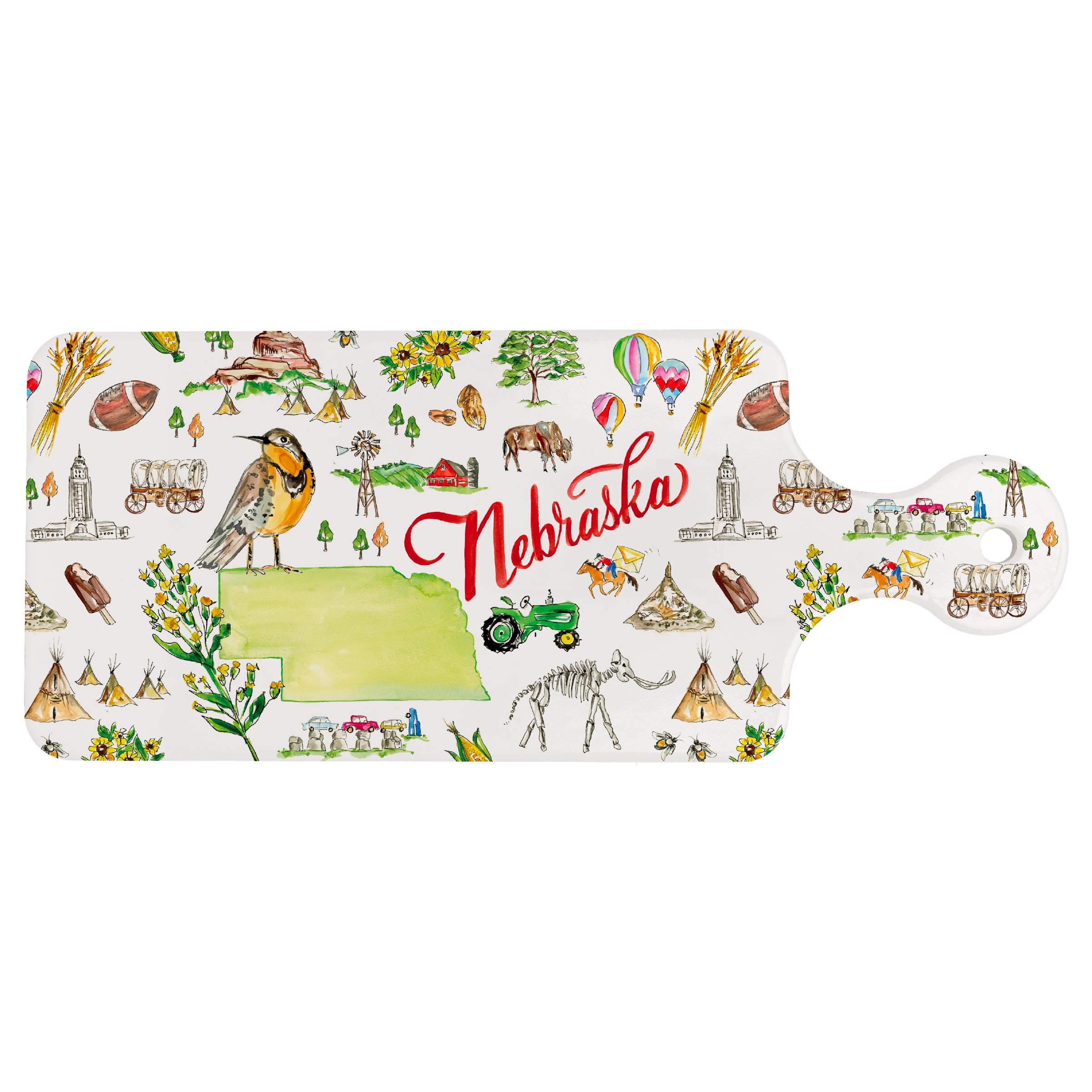 Celebrate the Cornhusker State with this ceramic trivet, illustrated in a lively watercolor collage of Nebraska icons surrounding a bold state silhouette. Heat-safe and easy to wipe clean, the NE State Cuterie protects tabletops and countertops while adding a display-worthy pop of hometown pride. Approximate dimensions are 11.5 x 4.75 x .25 inches.