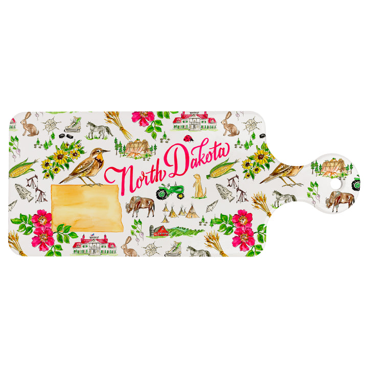 Bring state pride to the table with the ND State Cuterie, a ceramic trivet splashed with lively North Dakota icons and bold script. Durable and display-worthy, it protects countertops from hot dishes while adding a pop of personality to everyday gatherings. Approximate dimensions are 11.5 x 4.75 x .25 inches.