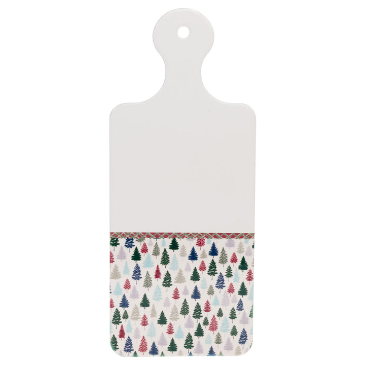 Bring a whisper of the Nordic woods to your table with this handled trivet, where a smooth ceramic surface is dressed in colorful tree motifs. A cork backing protects and grips tabletops while the easy-hang handle makes it simple to carry hot dishes or press it into service as a petite serving tray. Approximate dimensions are 11.5 x 4.75 x .25 inches.