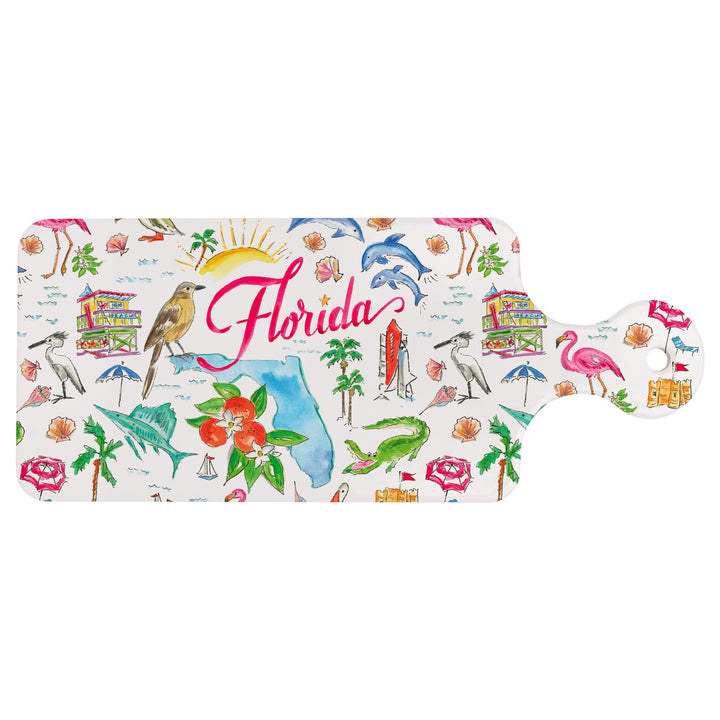 Bring Florida flair to the table with the FL State Cuterie ceramic trivet, illustrated in vibrant watercolor icons from oranges and flamingos to dolphins and palms. Durable and easy to wipe clean, it protects surfaces from hot dishes and hangs by its handled shape for a cheerful display. Approximate dimensions are 11.5 x 4.75 x .25 inches.