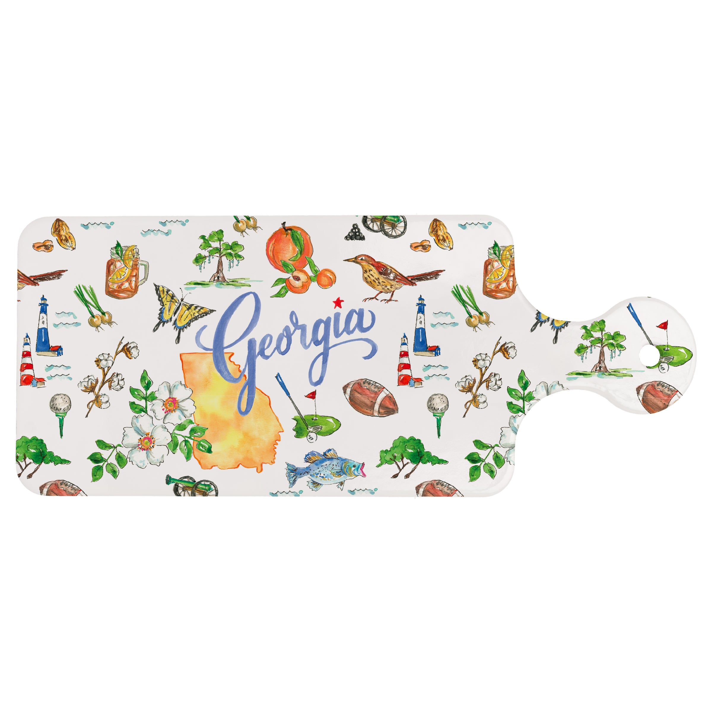 Celebrate the Peach State at the table with the GA State Cuterie ceramic trivet, alive with colorful illustrations of Georgia icons. Crafted to shield countertops and dining surfaces from hot cookware, this artful piece doubles as a charming serving accent or display-worthy décor. Approximate dimensions are 11.5 x 4.75 x .25 inches.