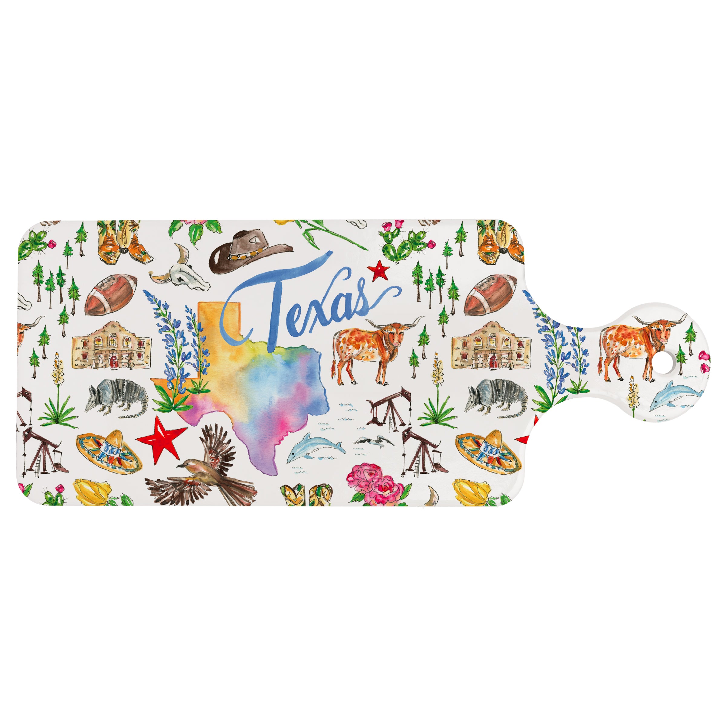 Celebrate the Lone Star State with this ceramic TX State Cuterie trivet, splashed with watercolor Texas art and charming icons from longhorns to bluebonnets. Durable and heat-ready, it protects surfaces from hot pans while adding a pop of state pride to casual grazing and everyday gatherings. Approximate dimensions are 11.5 x 4.75 x .25 inches.