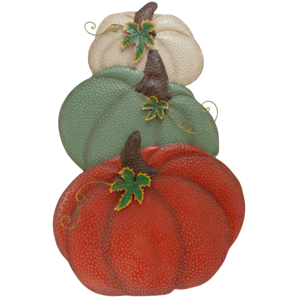 A trio of stacked pumpkins in ivory, sage, and classic orange is crafted from iron with a pebbled texture, curled tendrils, and leafy highlights for artful dimension. Durable and easy to style, this metal accent brings rustic charm and layered color to mantels, shelves, or entry vignettes. Approximate dimensions are 18 x 10 x 28 inches.