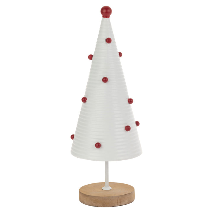 A sculptural cone of crisp white iron punctuated with playful red dots, this large tree accent brings clean, modern charm to shelves, mantels, and tabletops. Set on a wood-toned MDF base for stability, its textured ridges and bold pops of color make an artful focal point that layers effortlessly with everyday decor. Approximate dimensions are 5 x 5 x 13.75 inches.