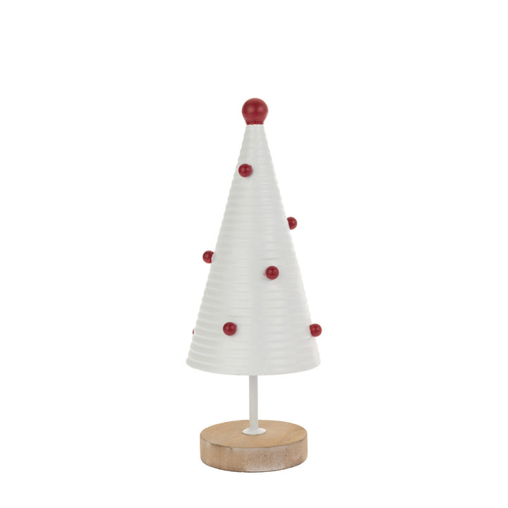 A crisp white iron tree, punctuated with glossy red dots, stands on a natural MDF base for an artful, modern accent. Small in scale but big on style, it adds playful color and sculptural texture to shelves, mantels, and curated vignettes. Approximate dimensions are 4 x 4 x 11 inches.
