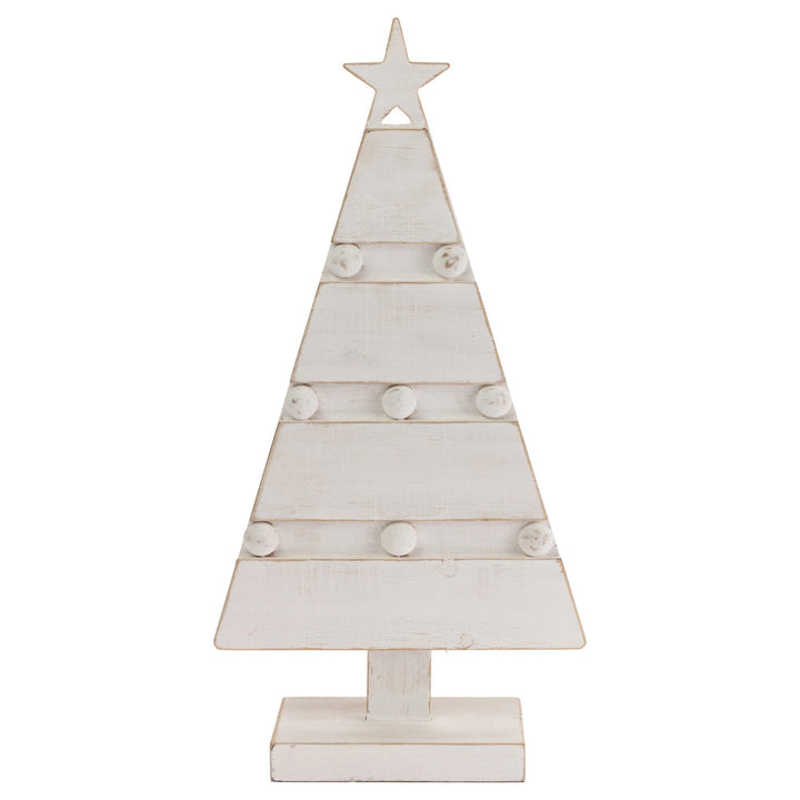 Hand-finished from MDF and fir wood, this large white beaded tree features a whitewashed, lightly distressed surface and a sleek, freestanding silhouette. Raised beads and a simple star finial add subtle texture and charm, making it an easy accent for consoles, mantels, or entryways in modern farmhouse or coastal spaces. Approximate dimensions are 8.25 x 3.5 x 16.5 inches.