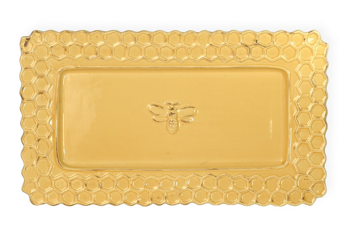 Crafted of durable stoneware, the Honeycomb Platter showcases a raised honeycomb border and a charming bee medallion that brings subtle whimsy to the table. Its elongated rectangular shape offers ample room for cheeses, breads, and small bites, making it a hardworking piece of serveware that layers effortlessly with everyday settings. Approximate dimensions are 13 x 7.5 x 1 inches.