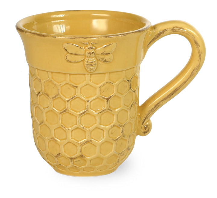 Crafted of stoneware, the Honeycomb Mug delights with a dimensional honeycomb texture and raised bee motif, all wrapped in a warm golden glaze. A comfortably curved handle and smooth lip bring hive-inspired charm to everyday coffee and tea moments. Approximate dimensions are 4 x 4 x 4.5 inches.