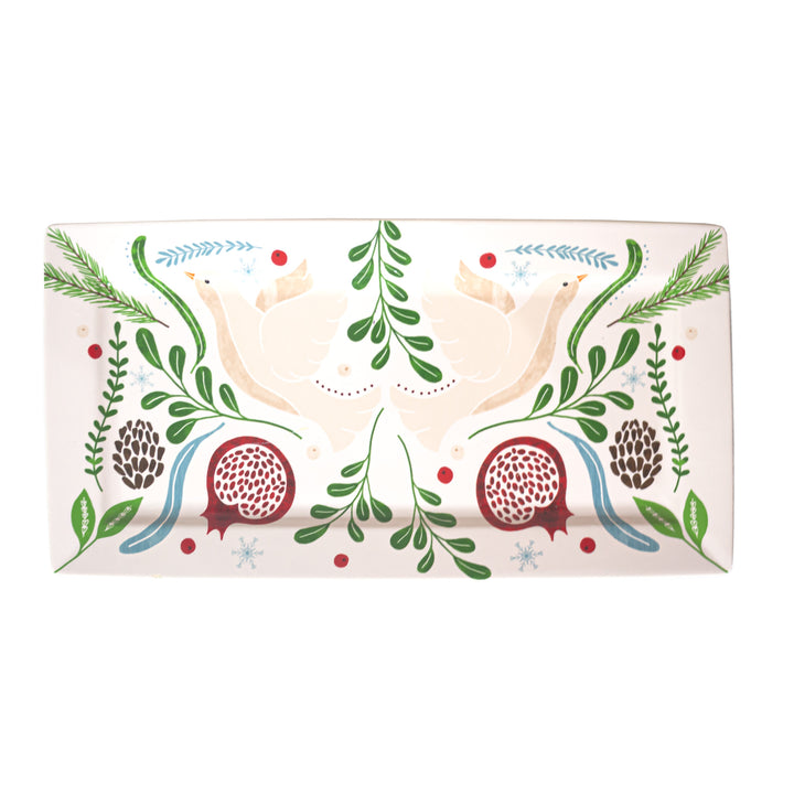 Crafted of ceramic, the Winter Berry Platter showcases an artful spread of greenery, holly, and berries that brings crisp seasonal charm to the table. Its refined rectangular profile is ideal for cheeses, pastries, or shared sides, pairing effortlessly with everyday place settings. Approximate dimensions are 14 x 7 x 1 inches.
