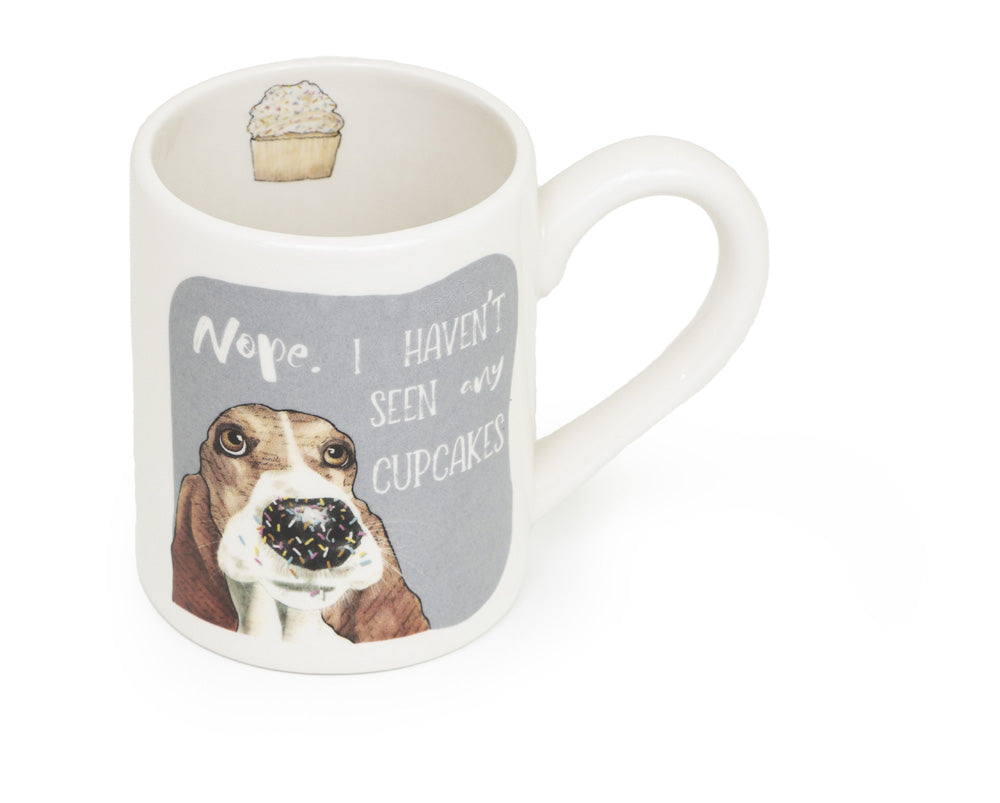 Bring a grin to every sip with this dolomite mug featuring a wide-eyed dog denying any cupcake sightings, plus a tiny sprinkle-topped cupcake illustrated inside the rim. Blending PETS—DOGS and DESSERTS themes, its smooth, sturdy feel and whimsical artwork make coffee breaks irresistibly sweet. Approximate dimensions are 5.5 x 3.25 x 4.25 inches.