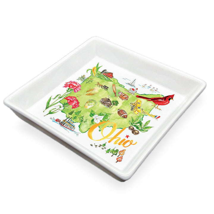 Celebrate the Buckeye State with our Ohio State Collection Caddy, a dolomite tray illustrated with a lively watercolor map and iconic motifs. Perfect for corralling keys, rings, or sinkside essentials, its weighty, smooth finish adds a curated touch to countertops, desks, and entry tables. Approximate dimensions are 6.25 x 6.25 x 1 inches.