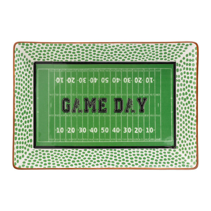 Bring stadium energy to the table with the Football Fever Platter, a rectangular dolomite piece featuring a vivid field graphic, speckled football-inspired border, and bold “GAME DAY” lettering. With a smooth, durable finish that spotlights everything from wings to brownies, this serveware essential turns every snack spread into a winning play. Approximate dimensions are 13.25 x 9.25 x 2.25 inches.