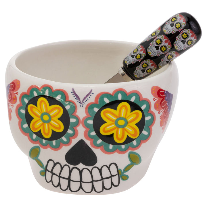 Turn every snack spread into a celebration with the No Vida Cantina Skull Bowl and Spreader Set, showcasing vivid floral skull art inspired by lively Latino cantina style. Crafted of durable, glossy dolomite, the sculpted bowl and coordinating spreader add playful color to salsas, dips, and soft cheeses from kitchen to table. Approximate dimensions are 4.5 x 4.5 x 3 inches.