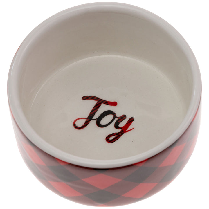 Bold and cheerful, the Joy Black & Red Check Bowl is crafted in smooth ceramic with a graphic buffalo-check exterior and a playful “Joy” scripted inside. Perfect for snacks, sides, or tabletop styling, this patterned serveware piece adds a lively pop of color to everyday meals and casual gatherings. Approximate dimensions are 3.75 x 3.75 x 2 inches.