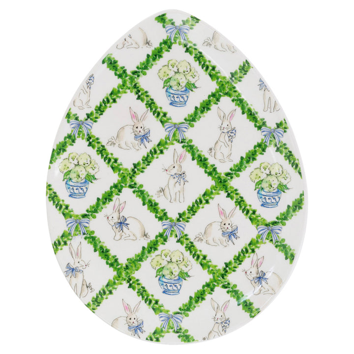 The Boxwood Trellis Egg Plate pairs a charming rabbit-and-greenery motif with an elegant egg-shaped silhouette to create a playful focal point for your table. Crafted of durable dolomite with crisp painterly detail, this serveware piece elevates small bites, desserts, or everyday nibbles with garden-inspired style. Approximate dimensions are 9 x 7 x .75 inches.