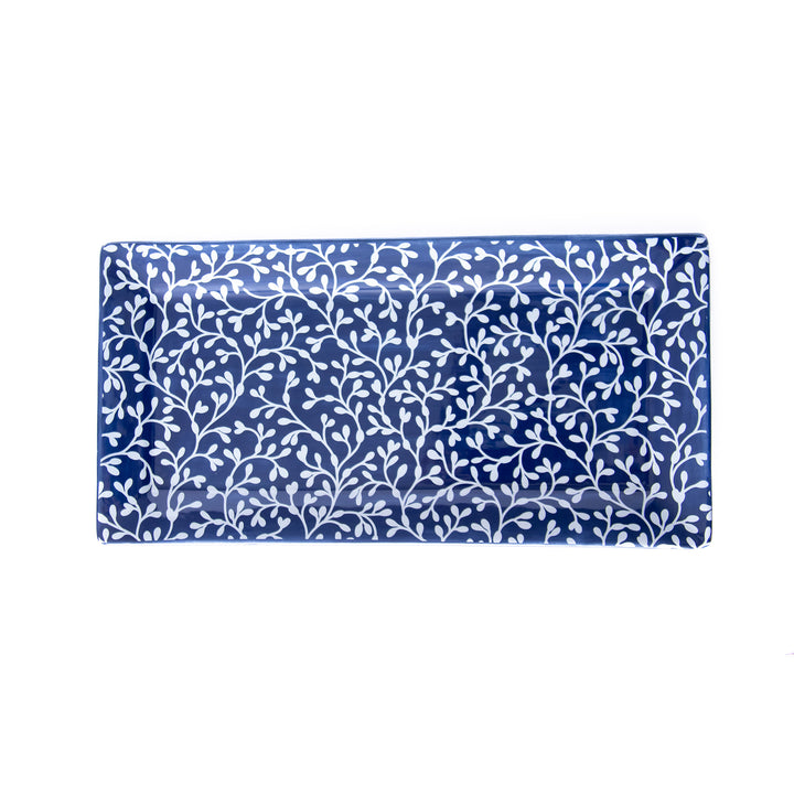 Bring coastal calm to the table with this rectangular dolomite platter, awash in deep navy and traced with a delicate seaweed motif. Its smooth, substantial feel beautifully frames everything from cheeses to sushi, making an easy-to-style foundation for everyday serving. Approximate dimensions are 14 x 7.25 x .75 inches.