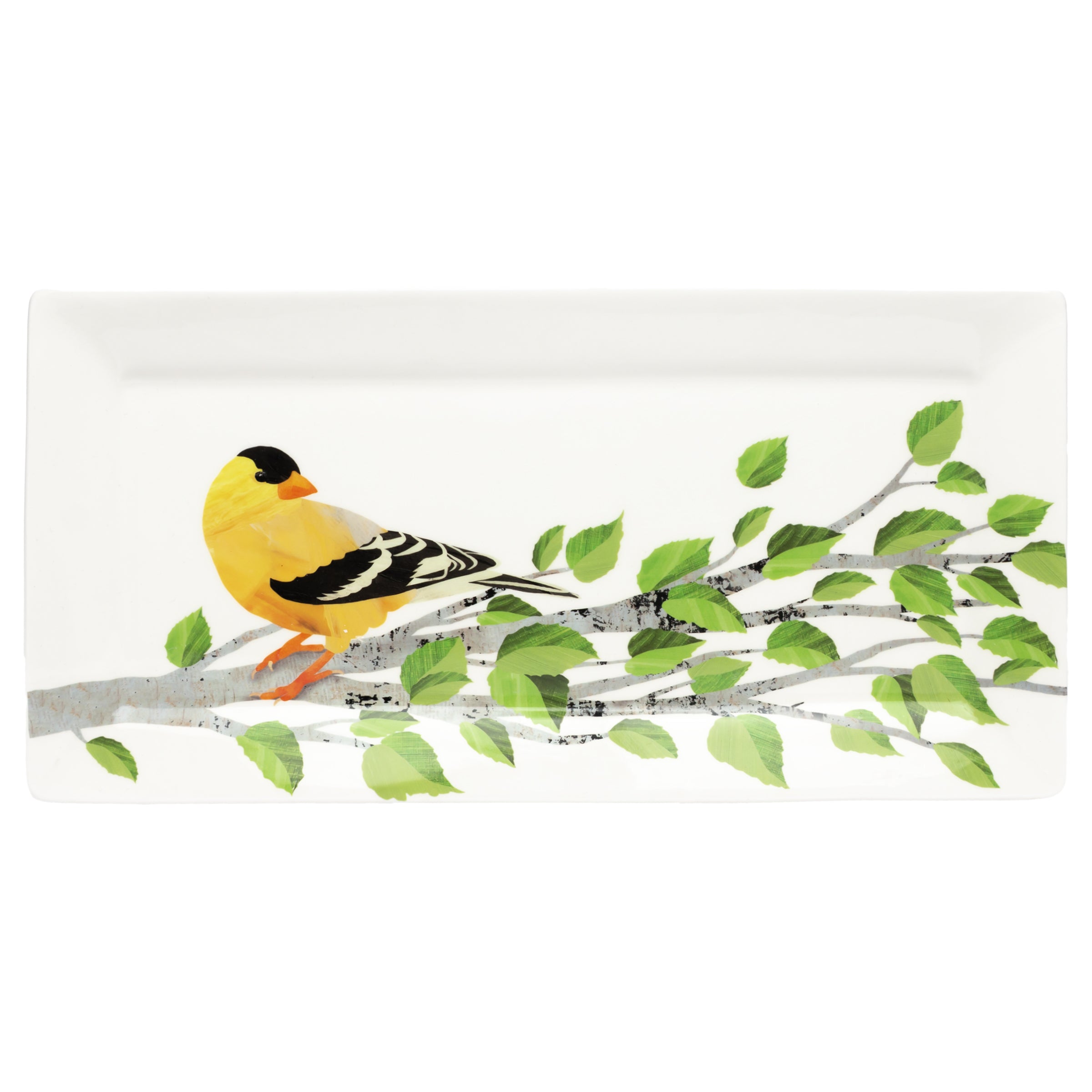 A bright American Goldfinch alights on leafy branches across this glossy dolomite platter, bringing a lively nature note to the table. The elongated rectangular surface is perfect for breads, cheeses, and shared bites, making this artful serveware piece both display-worthy and effortlessly versatile. Approximate dimensions are 14.25 x 7.25 x .75 inches.