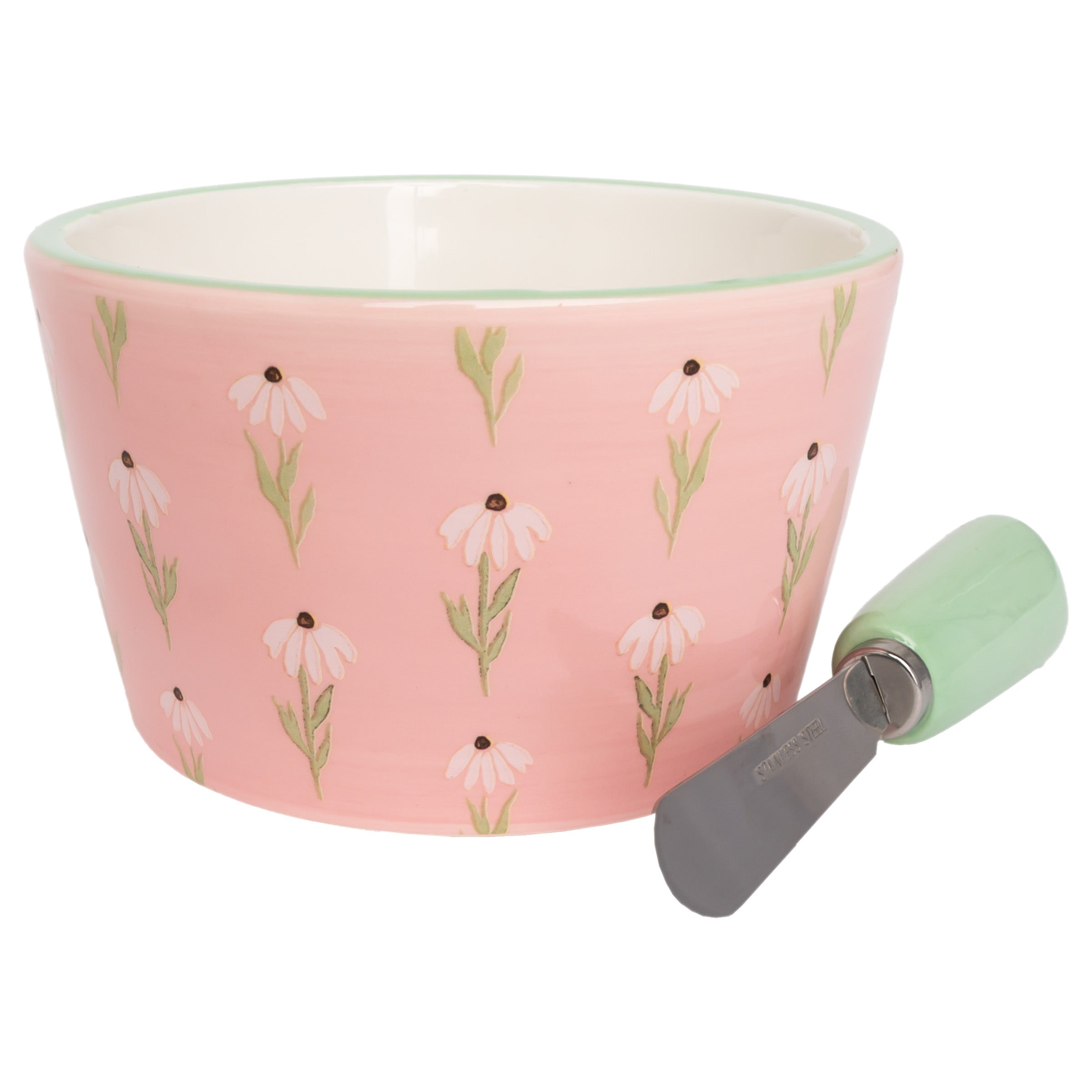 Bring an easy bloom to the table with the Pink Daisy Bowl and Spreader, a dolomite serveware duo patterned with delicate echinacea flowers. Perfect for dips, nuts, or soft cheeses, the coordinating spreader makes effortless serving feel charming and put-together. Approximate dimensions are 4.75 x 4.75 x 2.75 inches.
