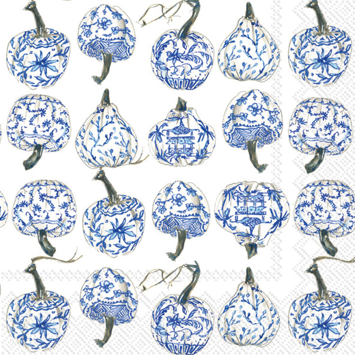 The Royal Pumpkins Lunch Napkin dresses the table with a crisp blue-and-white, chinoiserie-style pumpkin print that feels both artful and refined. Printed on quality paper for softness and reliable absorbency, these lunch napkins make everyday meals and casual entertaining effortlessly polished. Approximate dimensions are 6.5 x 1 x 6.5 inches. German printed on soft, 3-ply paper.