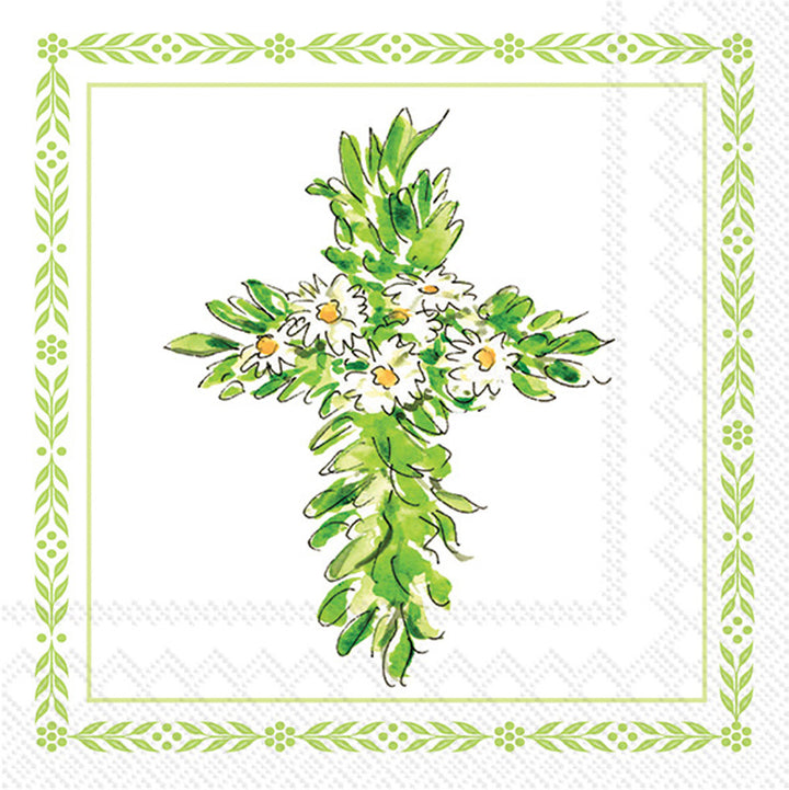 Honor meaningful moments with the Floral Cross Lunch Napkin, featuring a painterly cross formed by lush greenery and white blossoms, framed by a fresh botanical border. Printed on quality paper for dependable mealtime use, it lends a serene touch to baptisms, confirmations, memorials, and everyday gatherings while making cleanup simple. Approximate dimensions are 6.5 x 6.5 x 1 inches. German printed on soft, 3-ply paper.