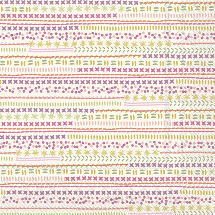 Bring artful charm to the table with our Sampler Stripes Lunch Napkin in Pink, featuring painterly stripe motifs that mimic hand-stitched details in rosy pink with accents of lilac and fresh green. Printed on soft, absorbent paper, these patterned lunch napkins brighten everyday lunches and casual gatherings while keeping cleanup simple. Approximate dimensions are 6.5 x 6.5 x 1 inches. German printed on soft, 3-ply paper.