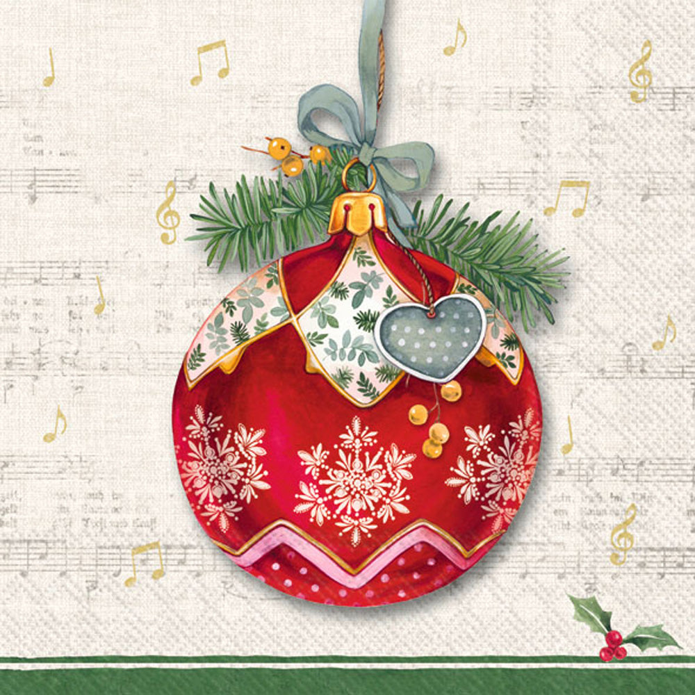 Set a joyful table with the Christmas Bauble Lunch Napkin in cream, featuring an artful red ornament, holly accents, and delicate musical notes that add instant charm to place settings. These paper lunch napkins blend everyday ease with celebratory style, making casual meals and gatherings feel thoughtfully finished. Approximate dimensions are 6.5 x 6.5 x 1 inches. German printed on soft, 3-ply paper.