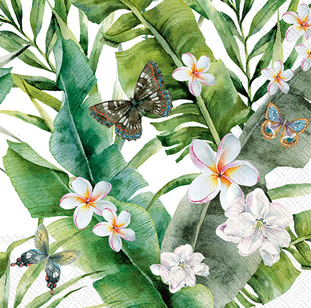 Awash in lush watercolor greenery, delicate tropical blossoms, and fluttering butterflies, the Jungle Leaves Lunch Napkin turns everyday meals into a little getaway. Made of soft, sturdy paper, this lunch napkin handles spills beautifully while adding a fresh, leafy accent to any table. Approximate dimensions are 6.5 x 6.5 x 1 inches. German printed on soft, 3-ply paper.