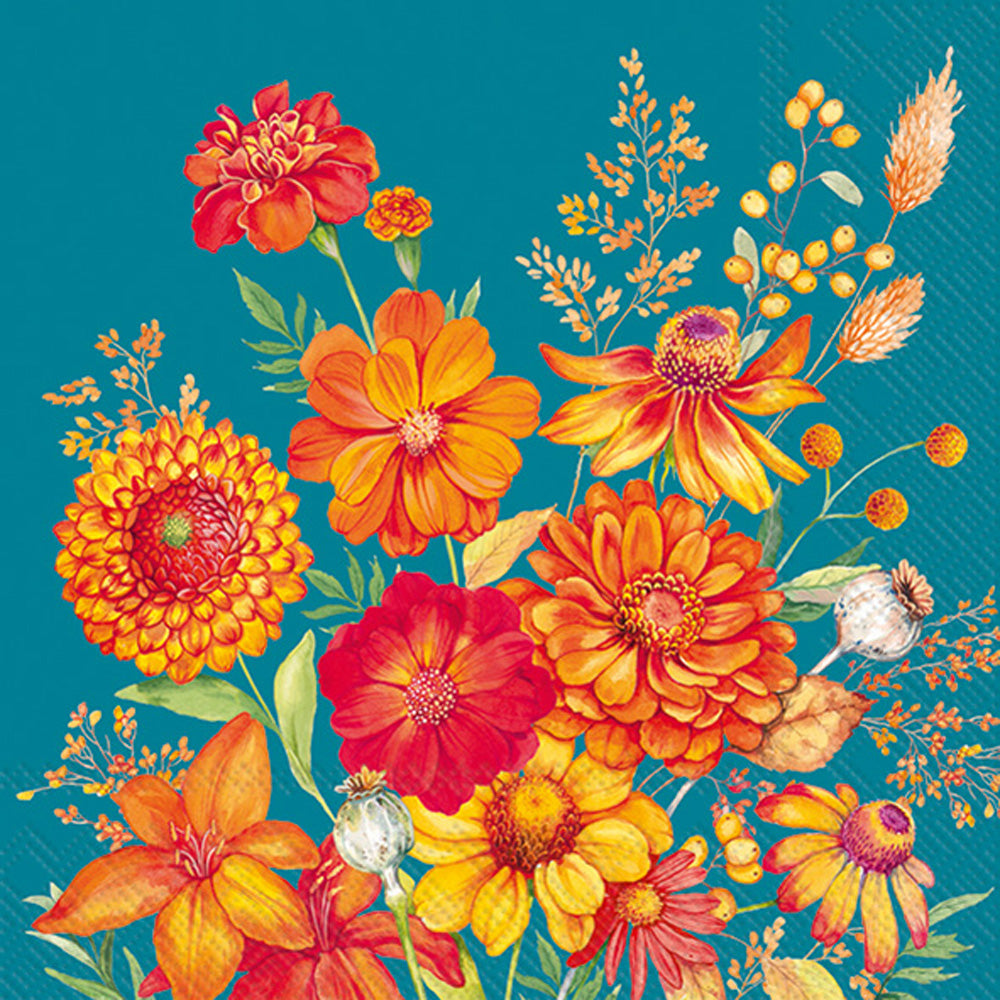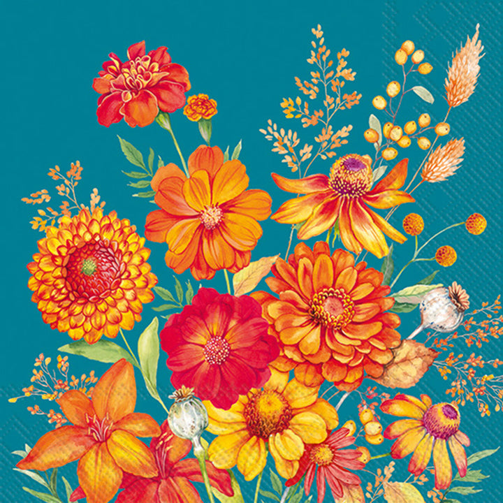 Vivid blooms in radiant oranges and reds burst against a rich petrol backdrop, giving the Arya Lunch Napkin instant tabletop drama. Printed on soft, absorbent paper, this floral lunch napkin elevates everyday meals and layers beautifully with solid dinnerware. Approximate dimensions are 6.5 x 6.5 x 1 inches. German printed on soft, 3-ply paper.
