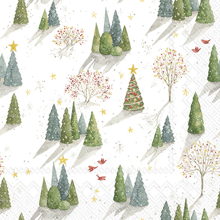 Bring a whimsical woodland touch to everyday meals with these paper lunch napkins, illustrated with watercolor evergreens, golden stars, and a charming decorated tree. Their artful pattern instantly elevates casual tablescapes while keeping cleanup simple. Approximate dimensions are 6.5 x 6.5 x 1 inches. German printed on soft, 3-ply paper.